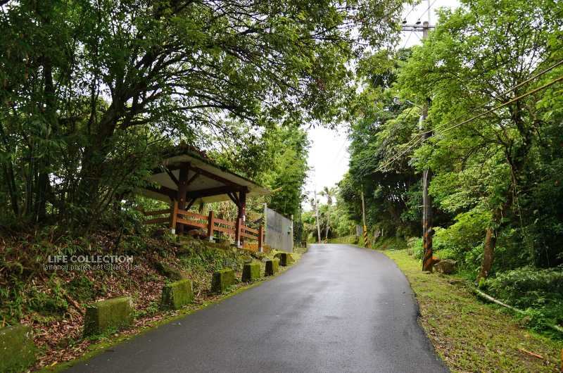 走出階梯步道就是萬溪產業道路,一旁是風櫃嘴涼亭,涼亭旁就是陽明山大縱走起點:風櫃口登山口,