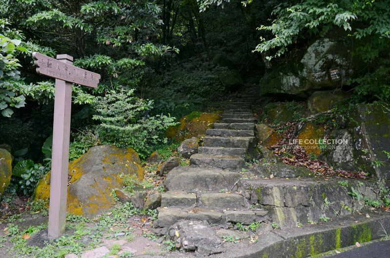 進入一處樹林步道,又陡又悶又喘,我柱著登山杖,吃力緩慢的一階一階,走的極慢,
