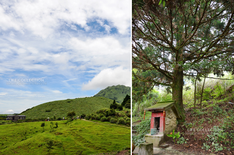環形步道上回望大草原,擎天崗遊客服務站及嶺頭喦土地公廟的後方是「擎天崗山」,
