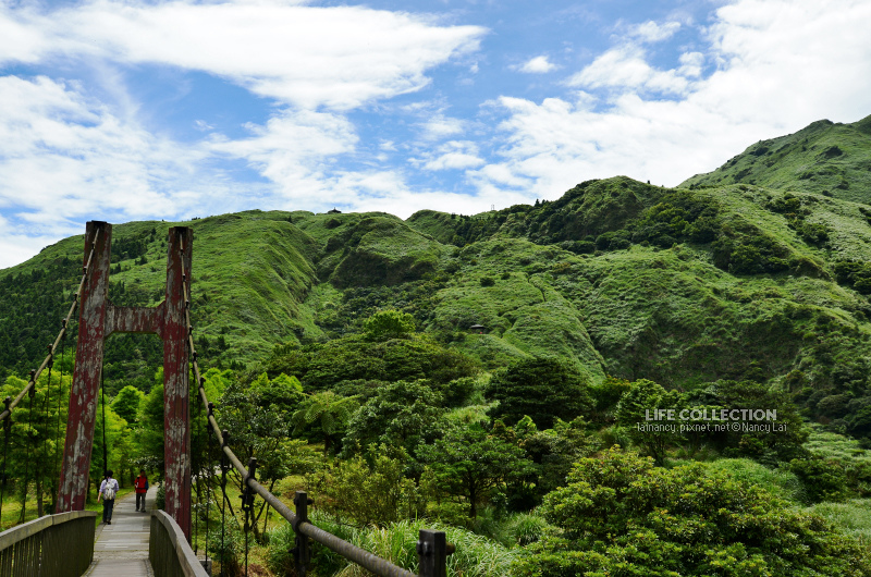 終於來到冷水坑遊客服務站附近的「菁山吊橋」,又完成一段步道,眼前是翠綠壯闊的七星山。