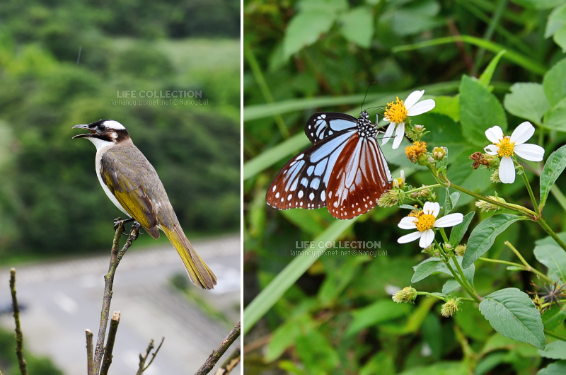 左圖:途中,一位伯伯指引我觀看「白頭翁」。右圖:採蜜中的「青斑蝶」,一路上看到許多蝴蝶,青斑蝶是大宗。