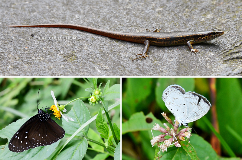 看似滑溜的「印度蜓蜥」,在咸豐草上取蜜的是「端紫斑蝶」雄蝶,停留在「島田氏澤蘭」上取蜜的是「琉璃小灰蝶」。
