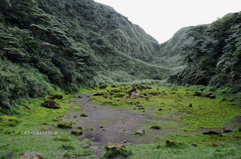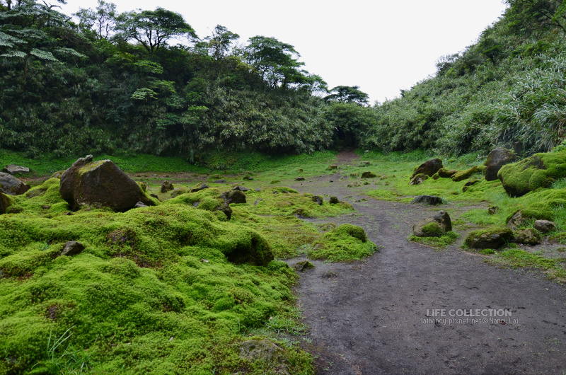 可是,一點池水也沒有,只有鮮艷綠色的苔蘚植物「土馬騌」與大大小小堆積在一塊的石頭。