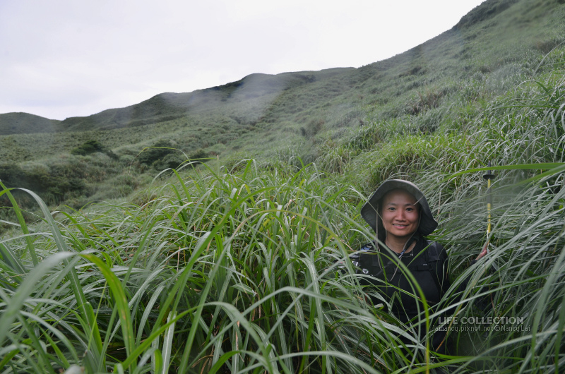 看看這芒草長得比我還高,我戴帽、穿長袖長褲,以杖撥草免去被割傷風險,