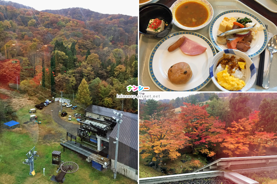 右下圖:餐廳窗戶外的這片楓樹,就位在一樓的溫泉池邊,昨晚我們可是邊泡湯邊賞夜楓。