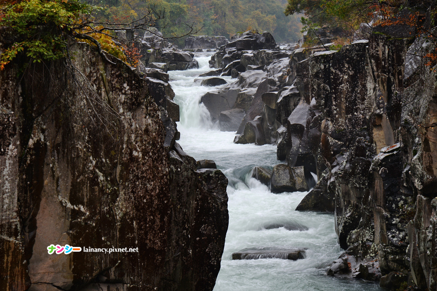 嚴美溪西方的「栗駒山」在過去的火山活動噴發後堆積的岩石,造成如今磐井川的奇岩、深淵、瀑布。