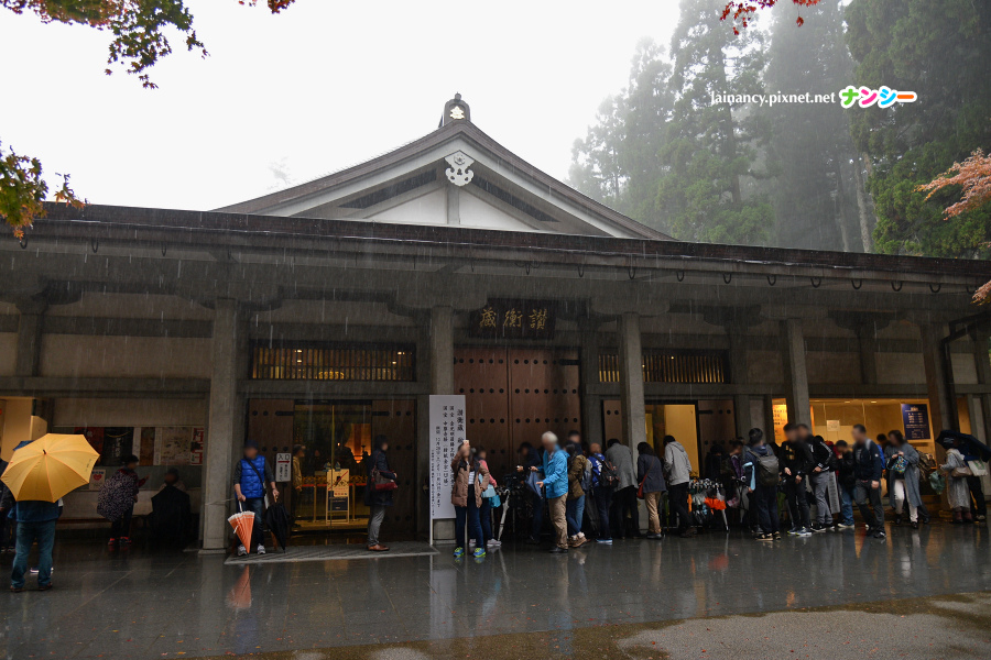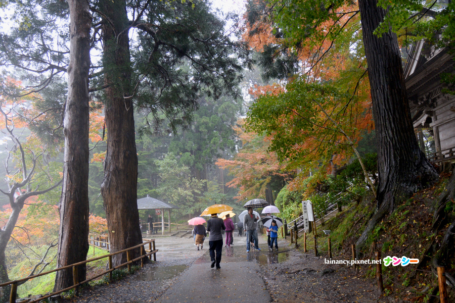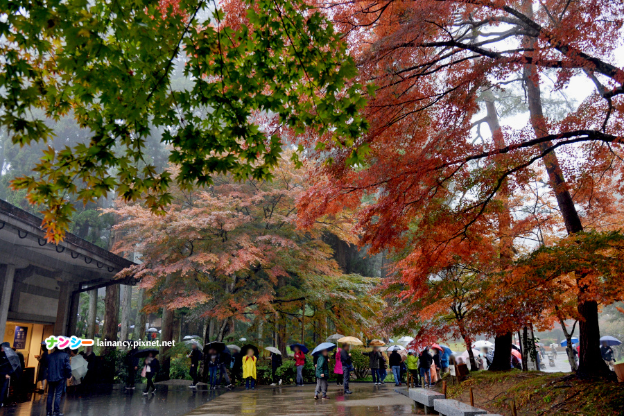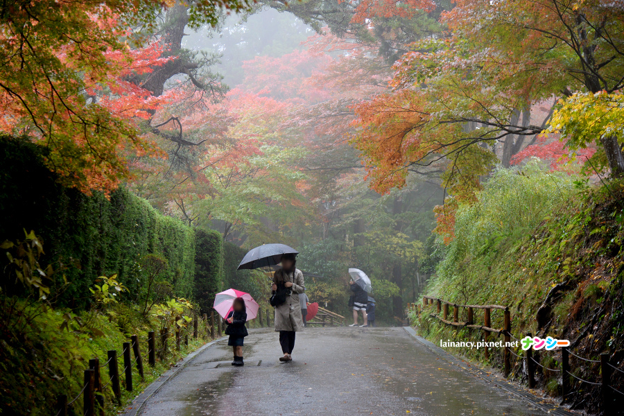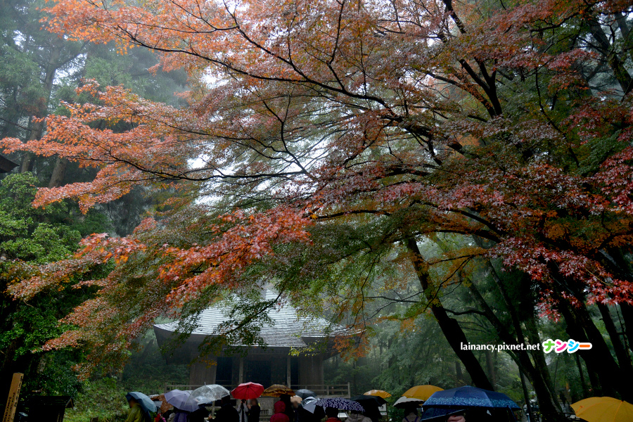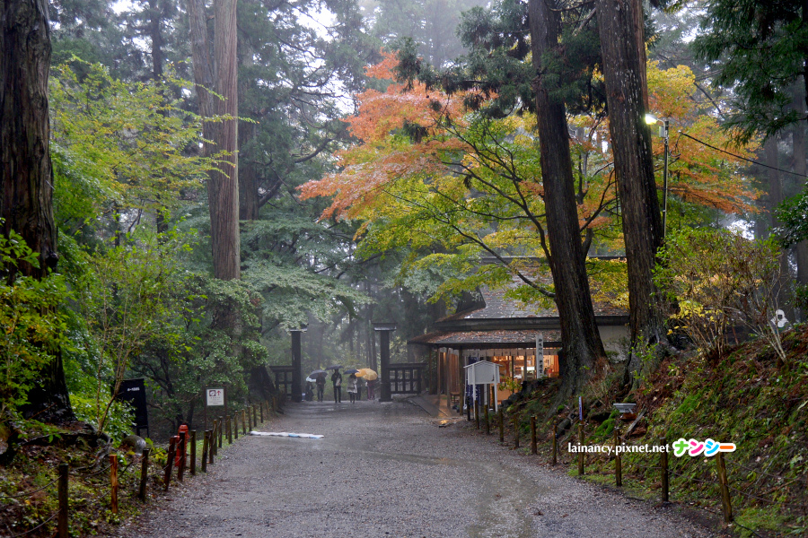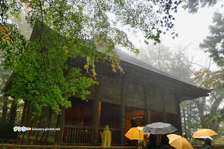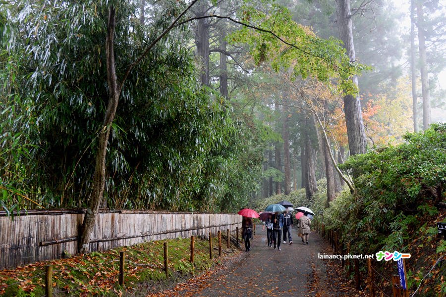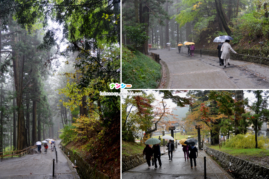 這段表參道稱為「月見坂」,兩旁一樣是樹齡三百年以上的老衫,月見坂因為下雨濕滑,大家都走的小心翼翼。