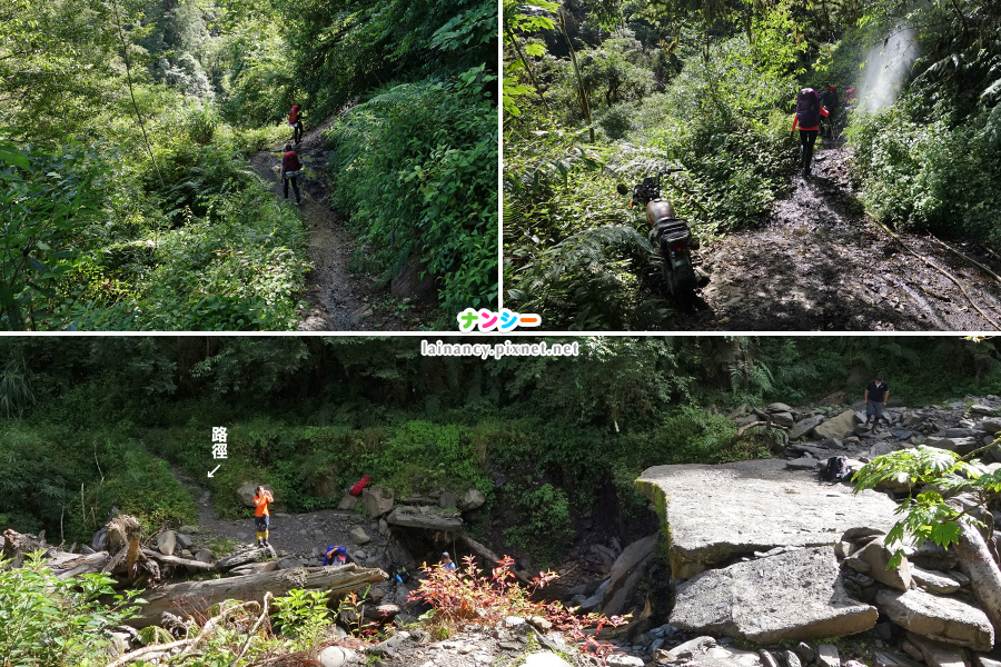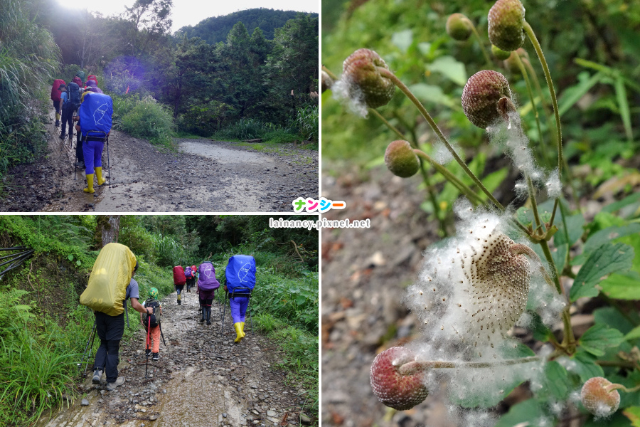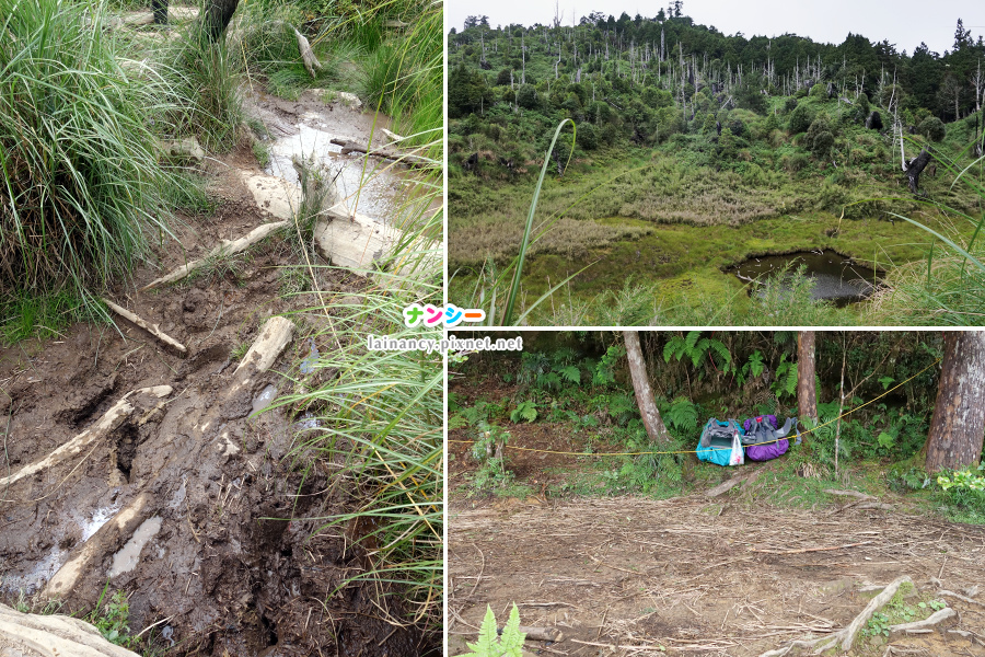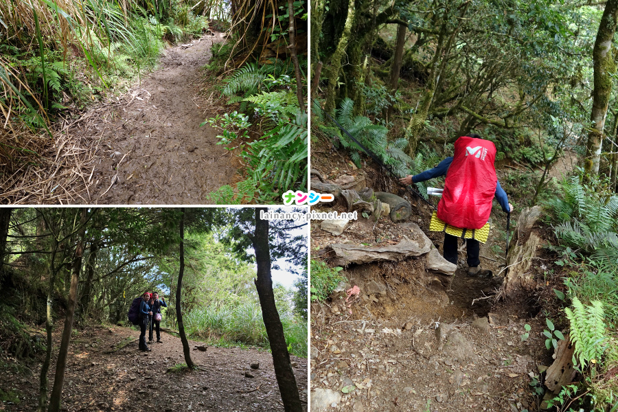 左上:一出發就是泥巴小徑,踩著前人放置的樹幹、樹枝小心通過。