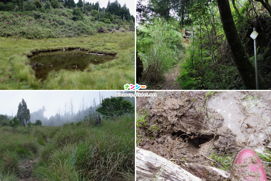 左下:路徑再度開闊,雲霧飄渺,腳下也泥濘得很。