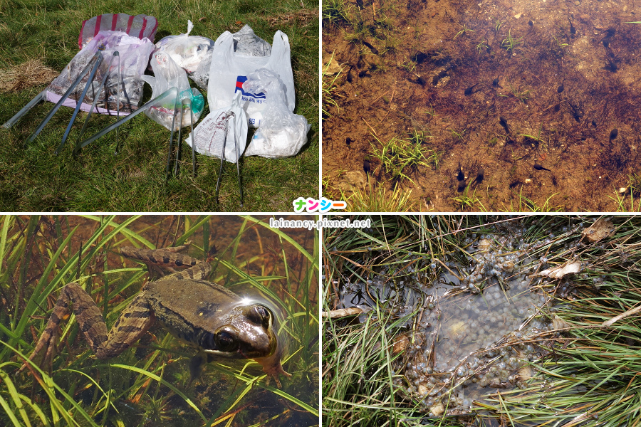 右下:在積水的草上看到的蛙卵,不像腹斑蛙的,比較像樹蛙之類。