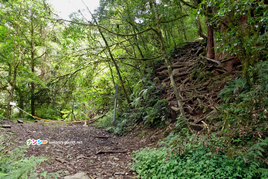 兩分鐘後就來到神木登山口,續走的路徑是往右側上行的樹根,前方的林道禁止通行。
