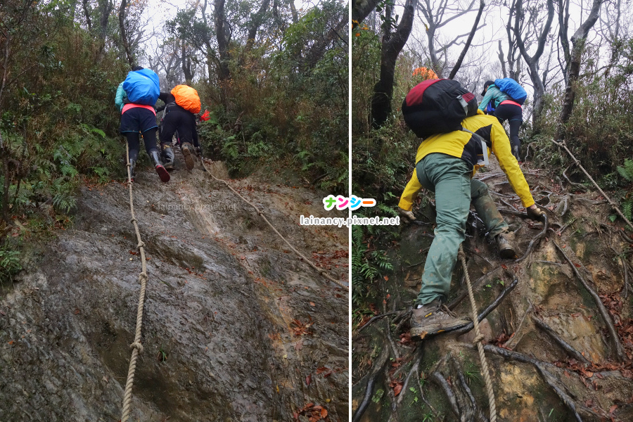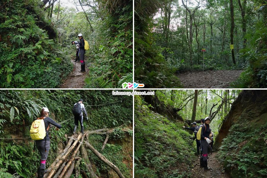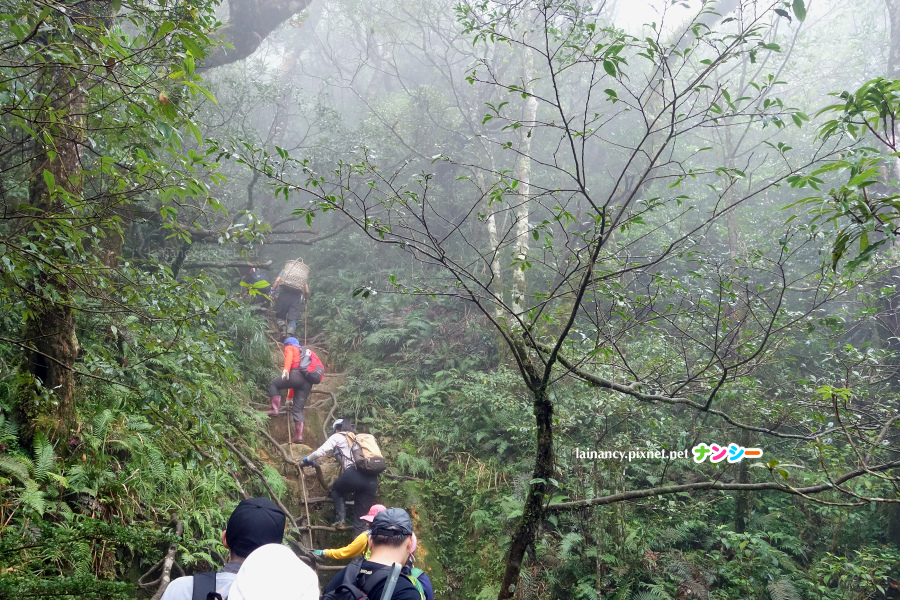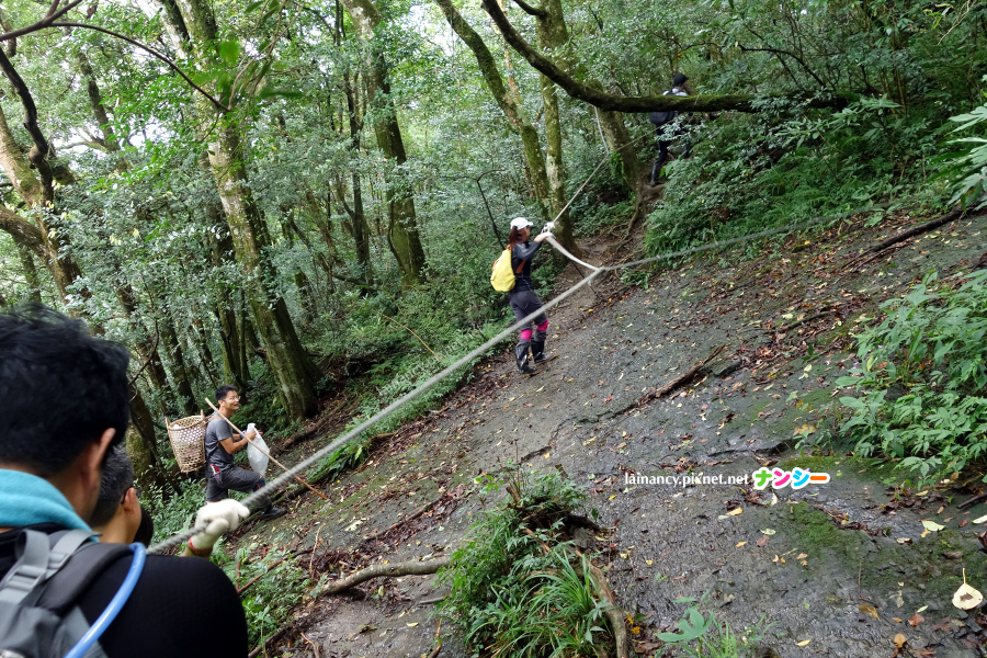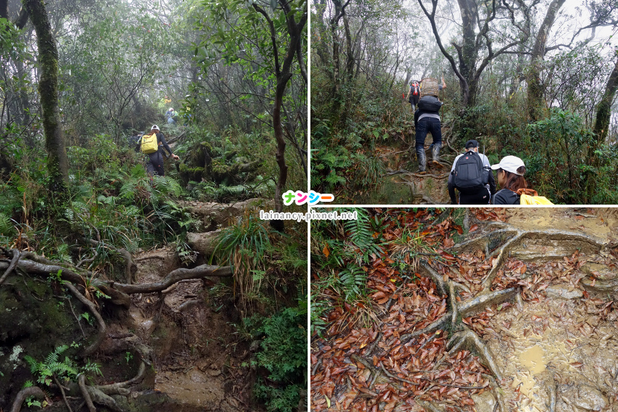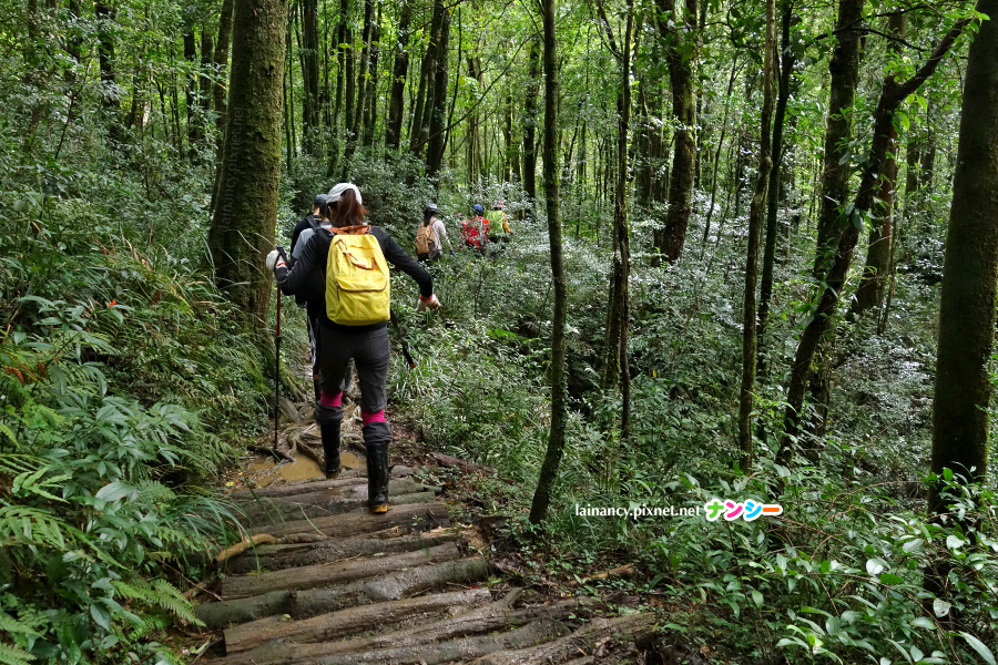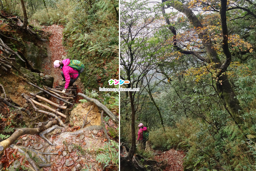 相較於滑溜溜帶著泥土的岩石路徑,走木梯省力多了,不過溼滑的狀態下,面對木梯還是要踏穩當心。