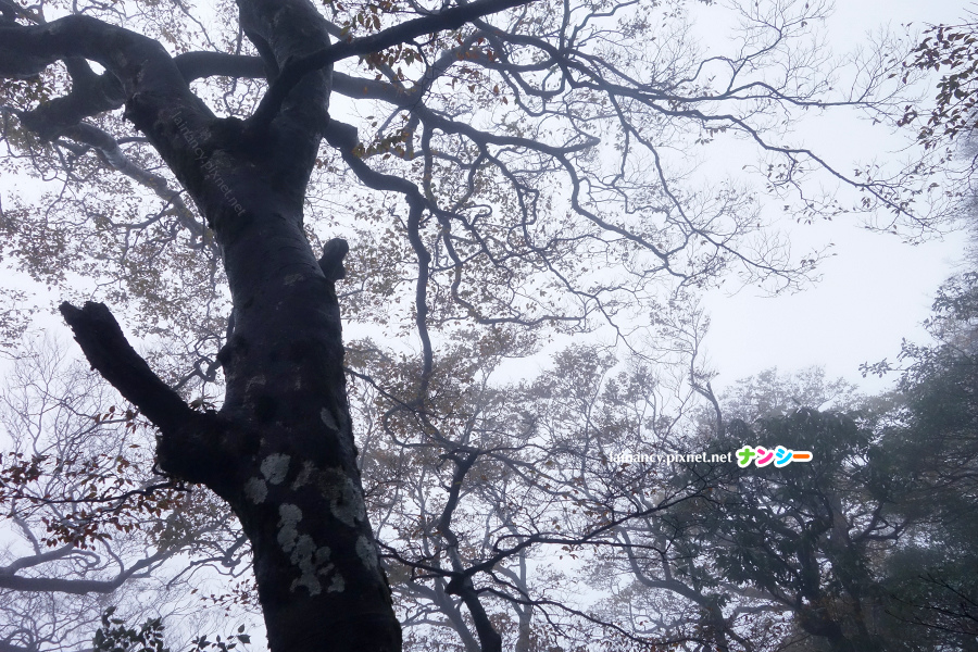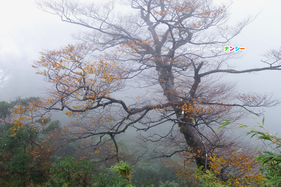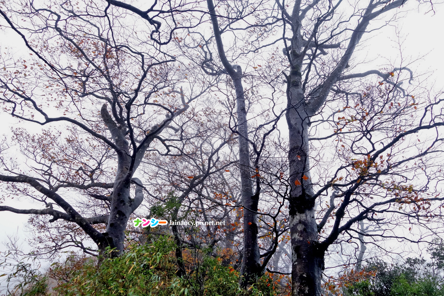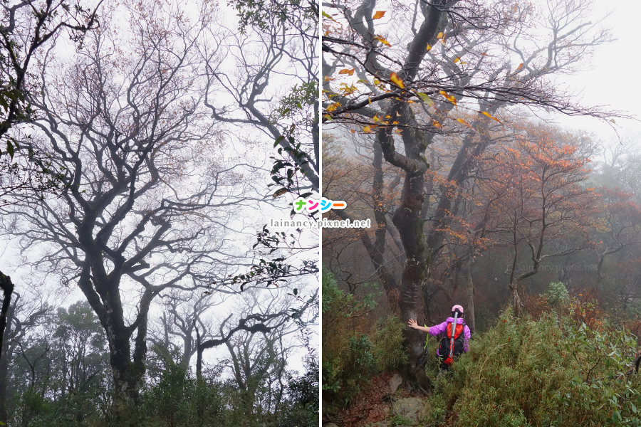 濃濃的白霧襯底,臺灣山毛櫸的模樣清楚可見。