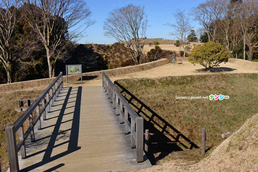 左邊的高臺是西の丸,右邊是西櫓,中間是西の丸堀,形式稱為障子堀,我想起了格子鬆餅。