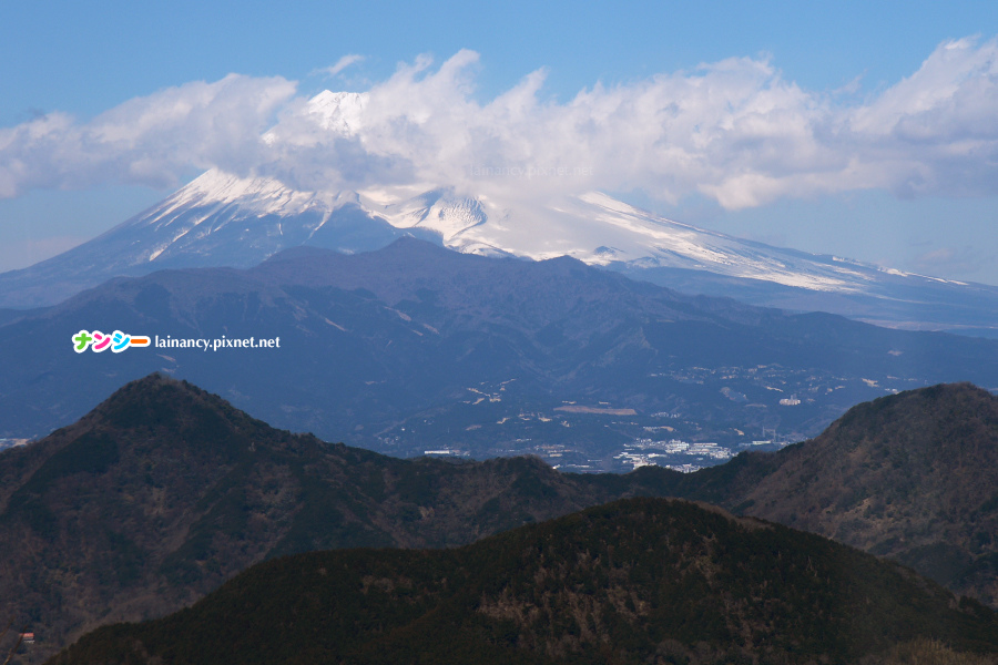 富士山山頂已經完全被白雲給蓋頭了,富士山的南邊是「愛鷹連峰」,
