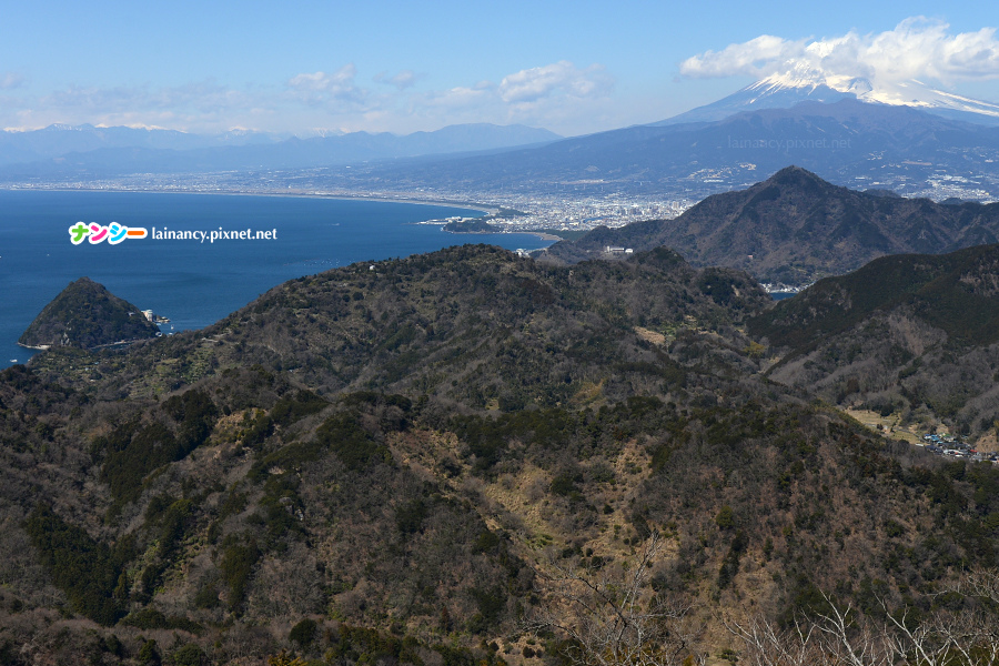 再往南是「沼津アルプス(阿爾卑斯山)」,連峰縱走醒目的尖尖山頭是「鷲頭山」,圖最右邊的是「太平山」。