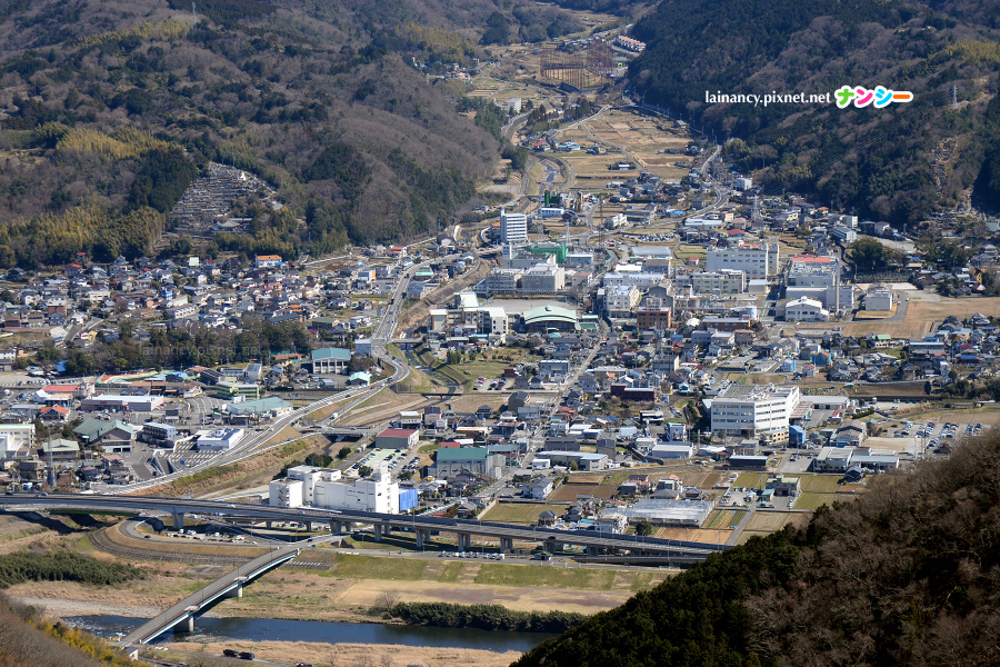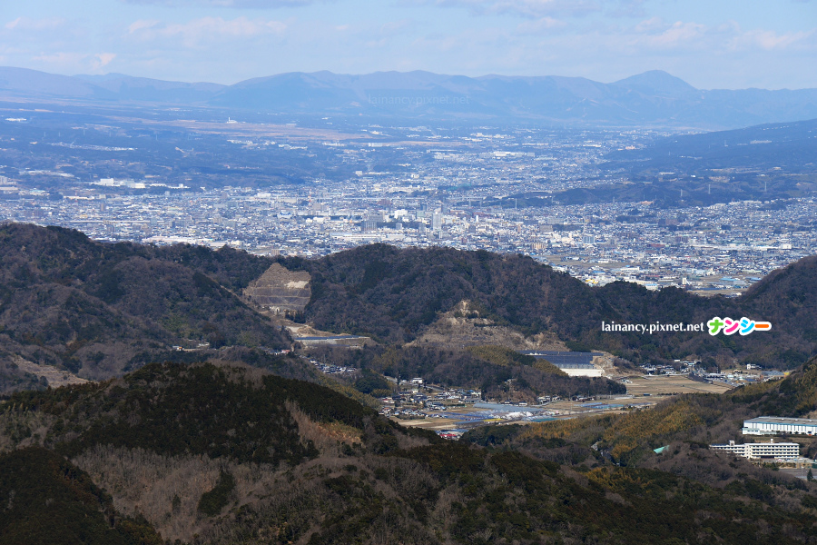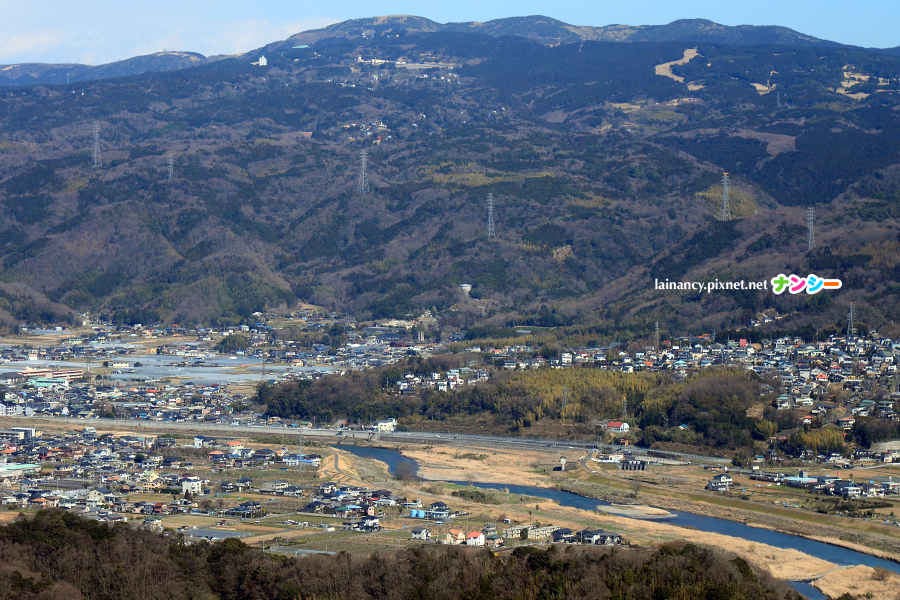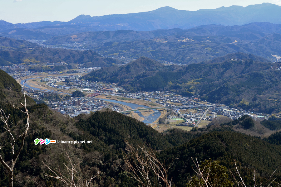 西北邊的大展望,正前方遠景是箱根地區,下方河川是「狩野川」。