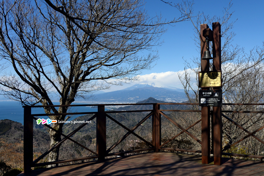 富士見露台西北側展望,富士山與駿河灣,海灣上的島嶼是「淡島」。