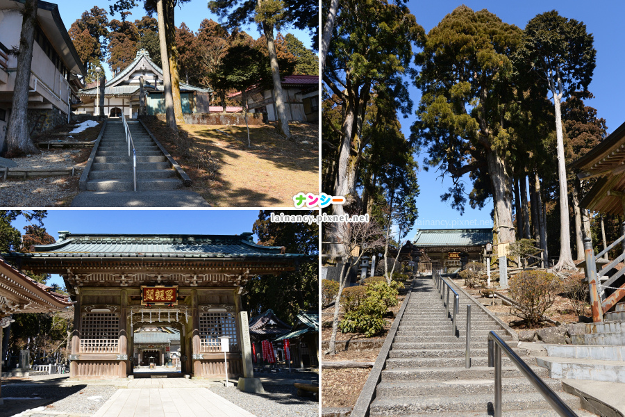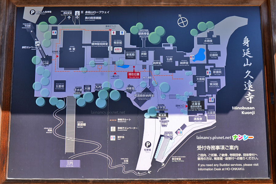 右下:走在山梨県道 804 號身延線往北,就看到久遠寺的歡迎布條,踏上階梯後的左側有身延山觀光案內所。