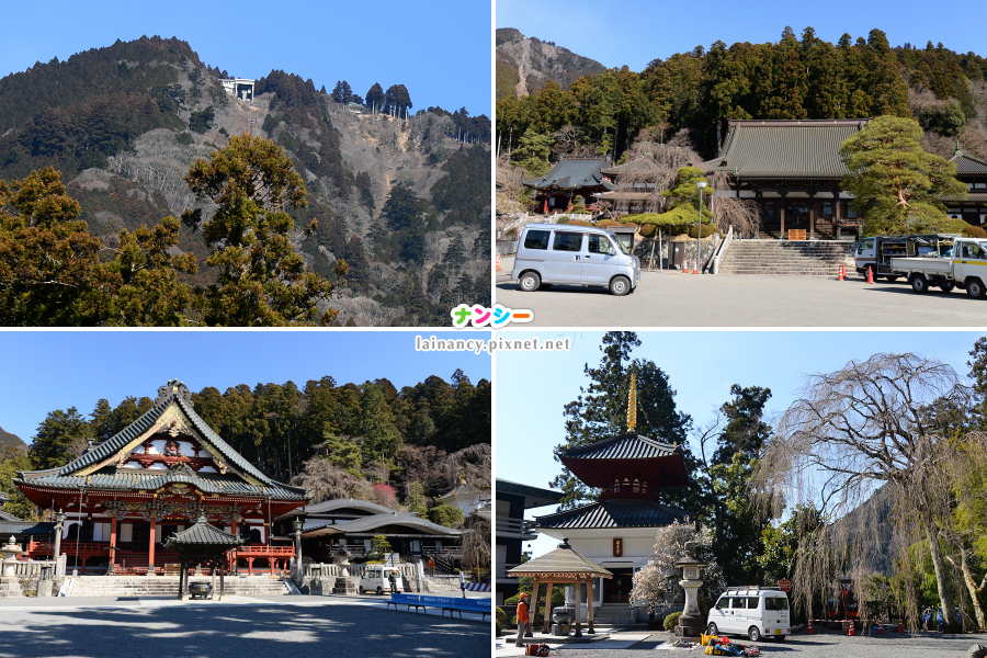 左上:從甘露門進入,抬頭就見到「身延山ロープウェイ」位在山頂的纜車站「奥之院駅」。