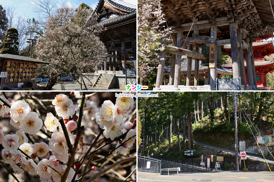 右下:開基堂,一旁是枝垂櫻,久遠寺境內的枝垂櫻及周邊的櫻花,在櫻花盛開時節吸引大批遊客前來賞櫻。