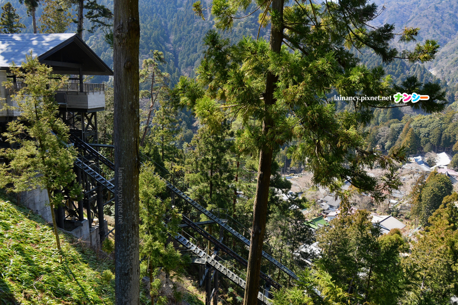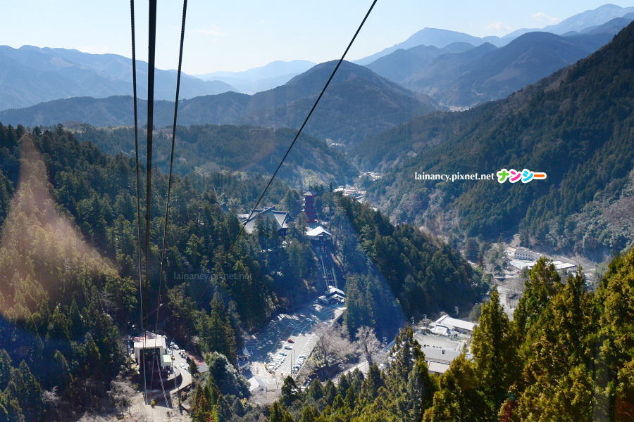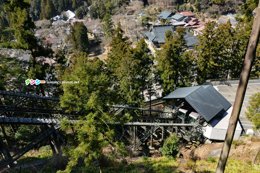 纜車緩緩駛離標高 390 公尺的久遠寺駅,居高臨下,見著五重塔、本堂,連結寺廟與停車場間還有個特別的設施。