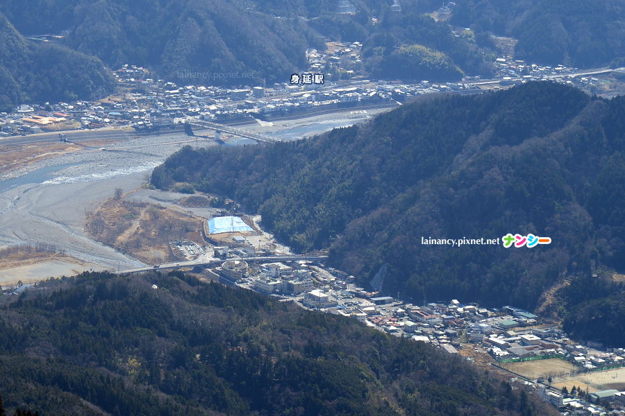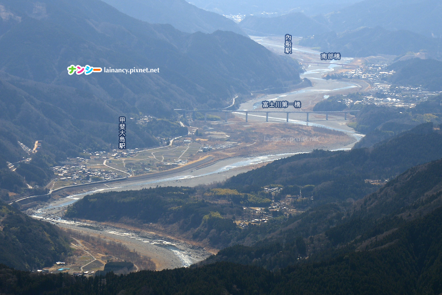 眼下的蜿蜒河川就是與 JR 身延線並行的富士川,方才巴士行經的路線也都可見。