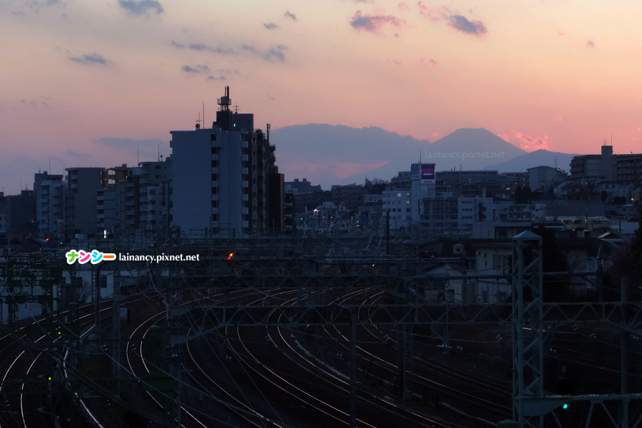 下午 6 點前,在橫濱市的新子安車站下車,然後走在跨越鐵道路線的公路橋上,驚喜地見到夕陽餘暉下的富士山,
