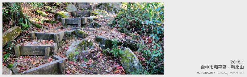 整齊階梯之後,見到許多碑牌,接著大石塊、土徑登山道開始,此路線為「本坂」。